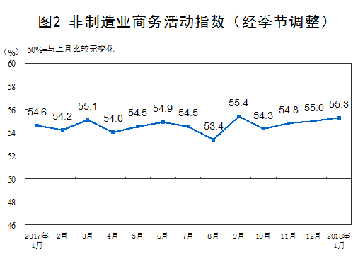 2018年1月份,中国非制造业商务活动指数为55.3%,高于上月0.3个百分点,非制造业延续稳中有升的良好发展态势。
